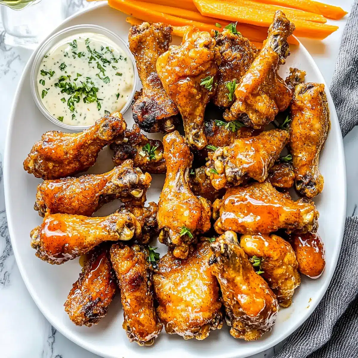 BBQ Chicken Drumsticks: Use chicken drumsticks instead of wings for a heartier option. They’ll still come out crispy and are perfect for BBQ sauce lovers.