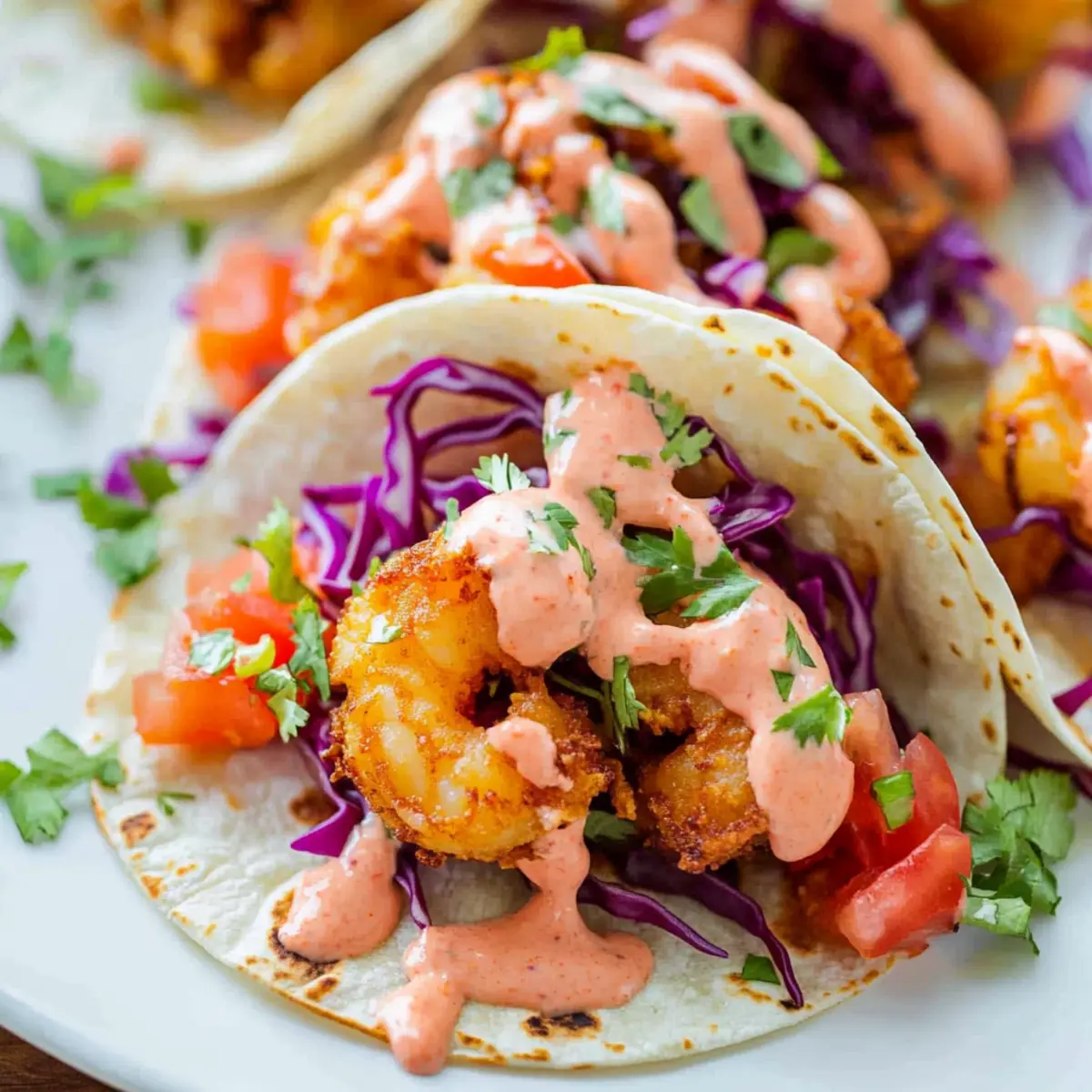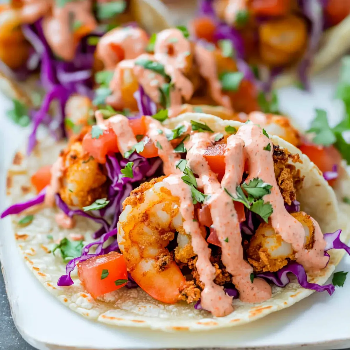Begin by lightly toasting 8 to 12 small corn tortillas over medium heat until warm and pliable. Layer each tortilla with fresh shredded cabbage, diced medium tomato, and the crispy shrimp. Drizzle the remaining sauce over the top and finish with a sprinkle of coarsely chopped cilantro, adding a burst of freshness to your delightful tacos.