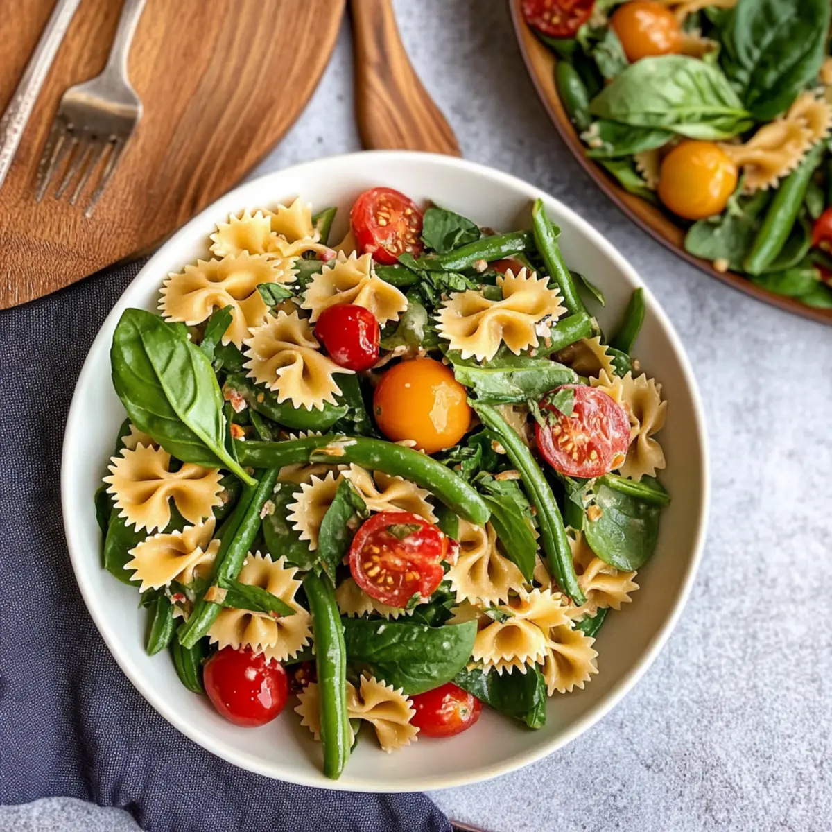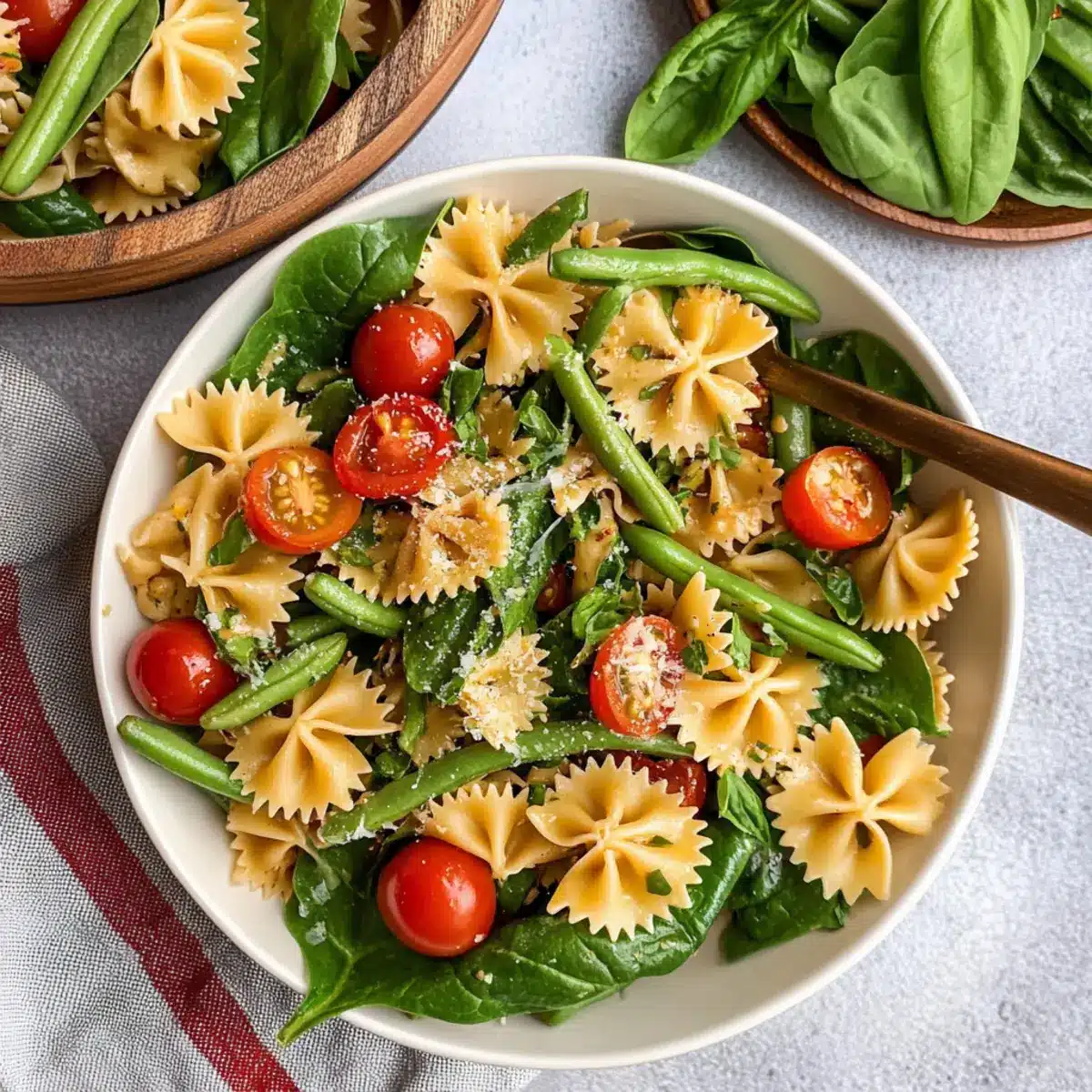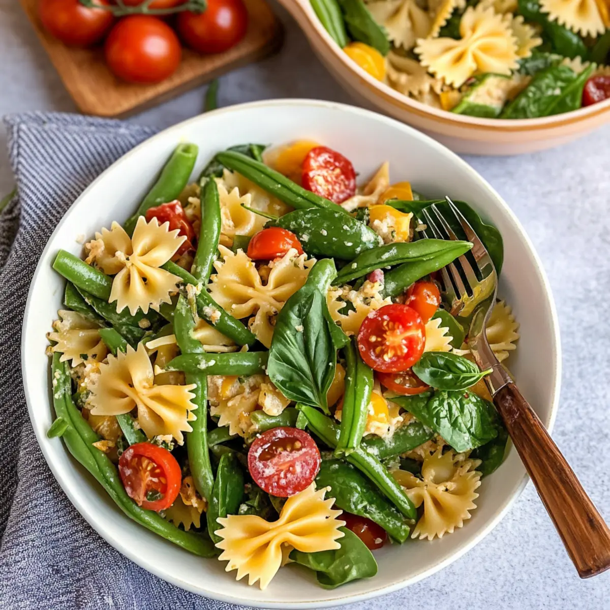 - In a large mixing bowl, combine the cooled pasta, blanched green beans, cannellini beans, thinly sliced green onions, halved cherry tomatoes, and baby spinach or arugula. Drizzle with dressing and toss gently.