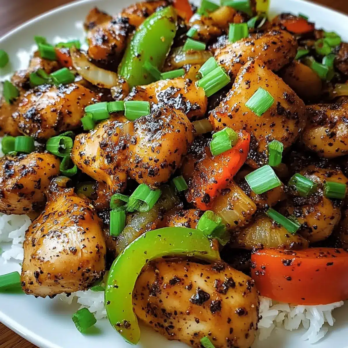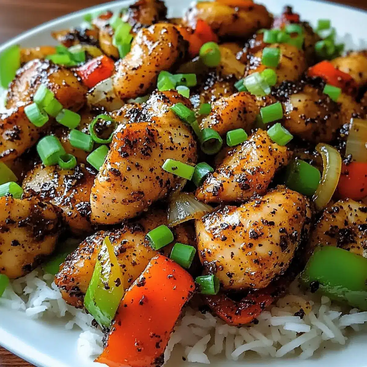Finally, remove the skillet from heat and garnish your Black Pepper Chicken with chopped green onions for a pop of freshness and color. Serve hot over steamed rice or noodles to soak up the luscious sauce, making this quick and spicy stir-fry a delightful centerpiece for your dinner table.
