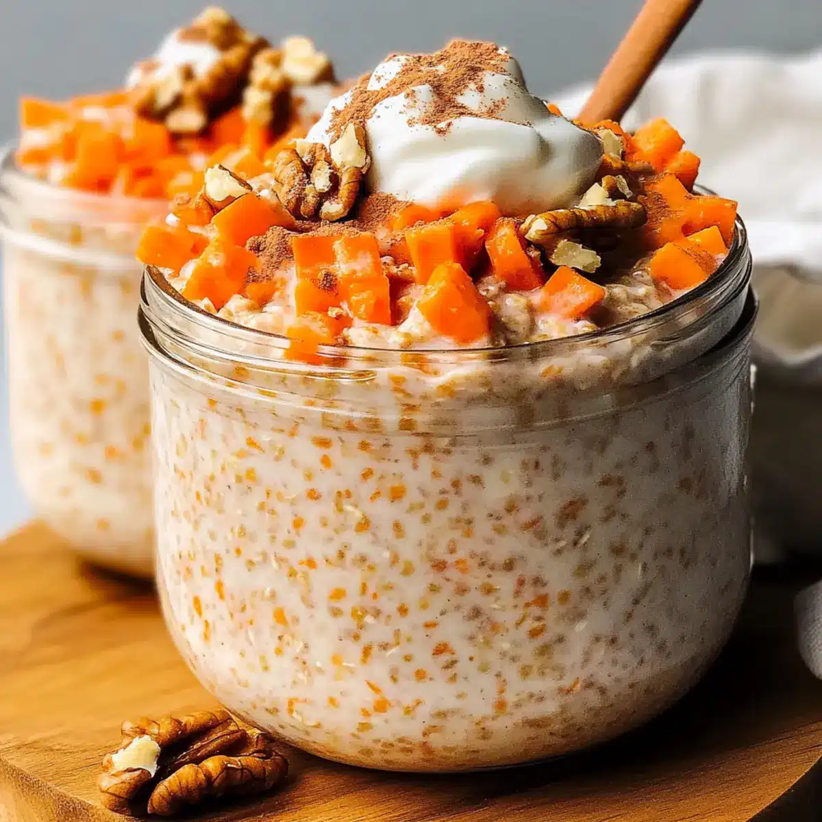 So many options! You can give your Carrot-Cake Overnight Oats a personal twist by adding a scoop of protein powder for an extra boost, or integrating seeds for added nutrition. Feel free to play with spices; incorporating ginger or nutmeg can change the flavor profile beautifully. Don’t forget toppings—raisins, dried apricots, or a drizzle of nut butter can elevate the experience, making it uniquely your own!