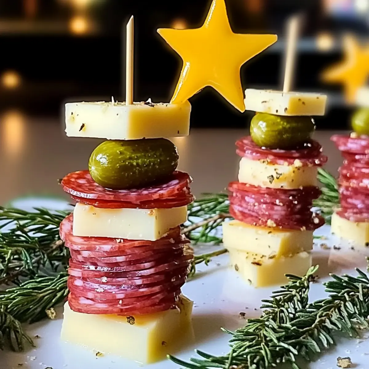 At the top of your assembled skewer, gently press the cheddar star you cut out earlier. This whimsical decoration will not only serve as a delightful garnish but also tie your Charcuterie Tree Skewers together beautifully, making each one look festive and inviting for your guests.