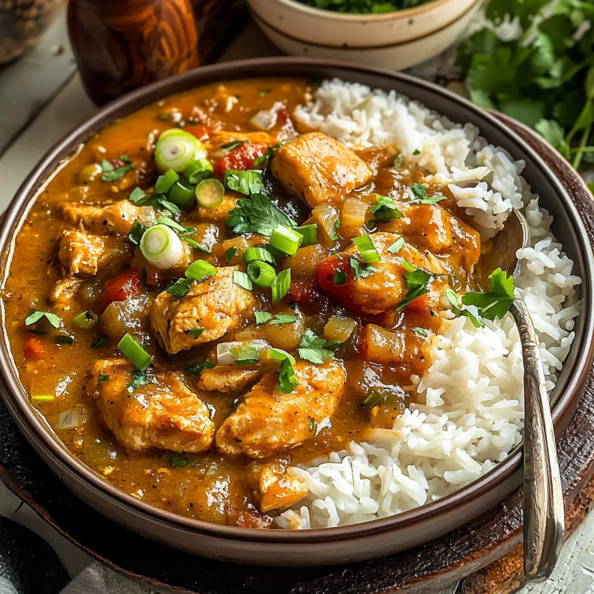 - Spoon the Chicken Étouffée over cooked white rice and garnish with green onions.
