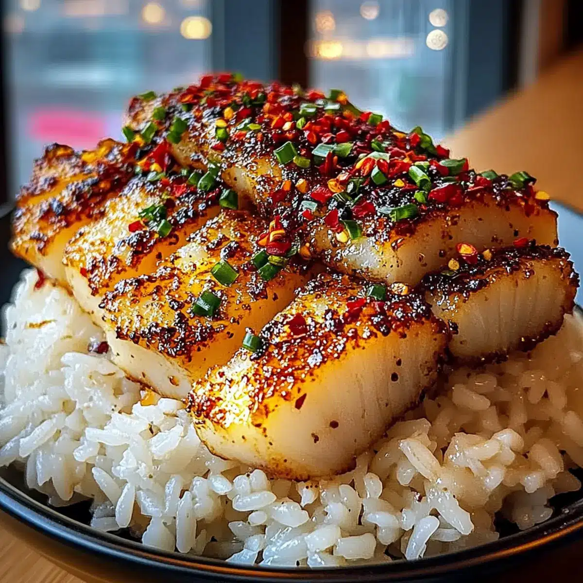 - Serve jasmine rice on each plate topped with crispy cod strips and drizzled with the chili garlic sauce.