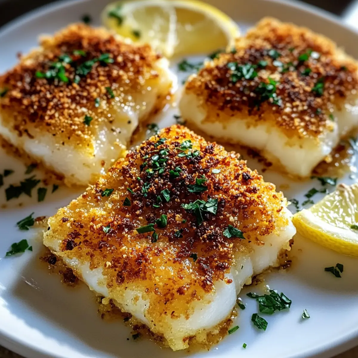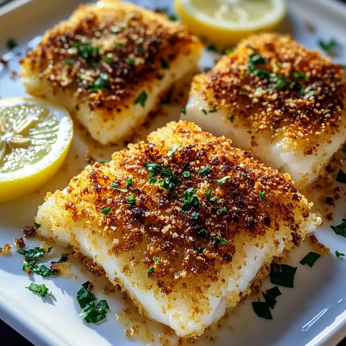 Once the cod is beautifully baked, remove it from the oven and promptly drizzle fresh lemon juice over each fillet. This brightens the flavors and adds a refreshing zing that perfectly balances the richness of the crispy coating. Take a moment to appreciate the beautiful presentation before serving.