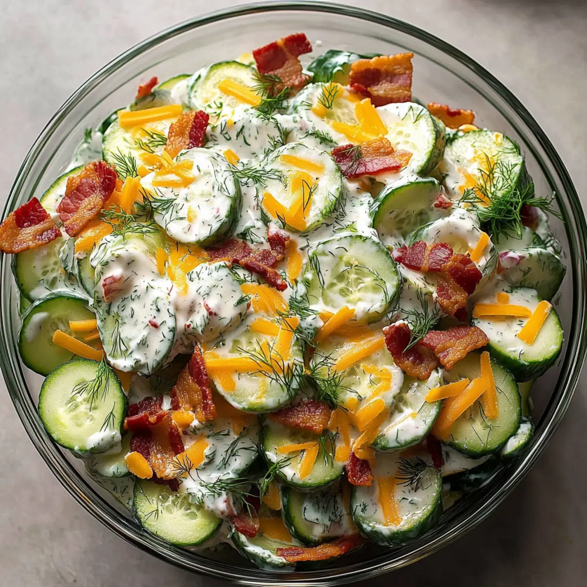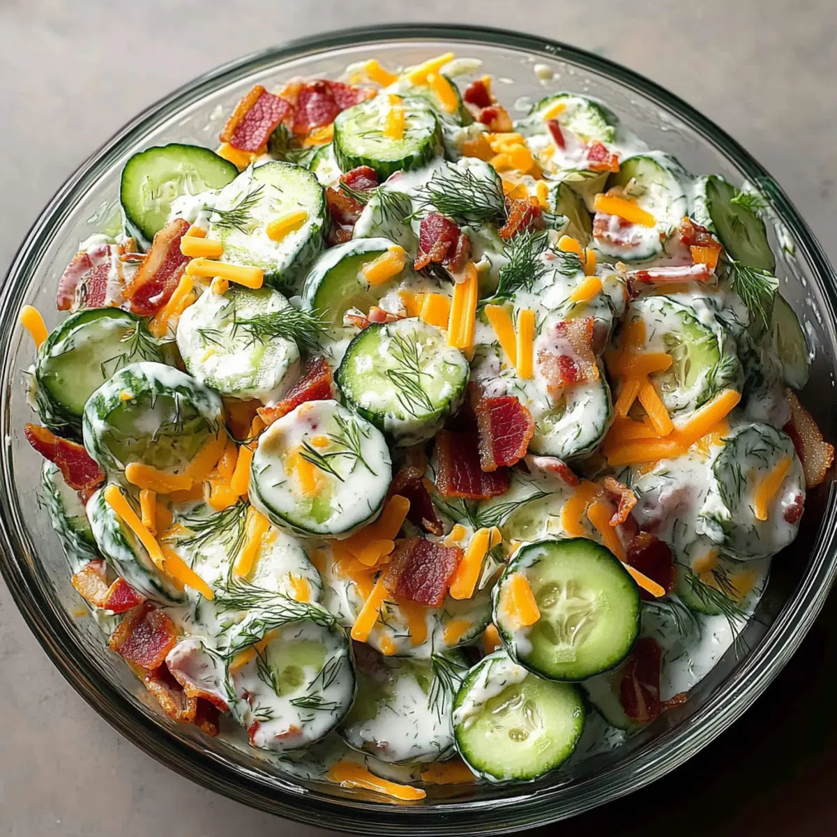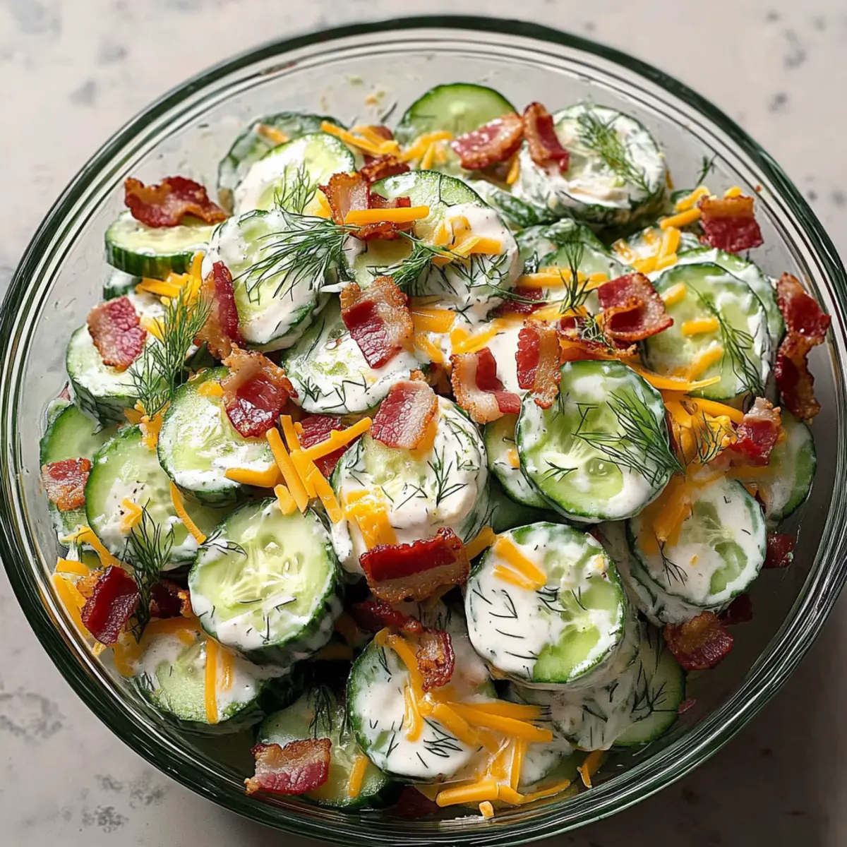 - Combine Ingredients: In a large bowl, combine cucumbers, crumbled bacon, cheddar cheese, red onion, and dill. Gently mix.