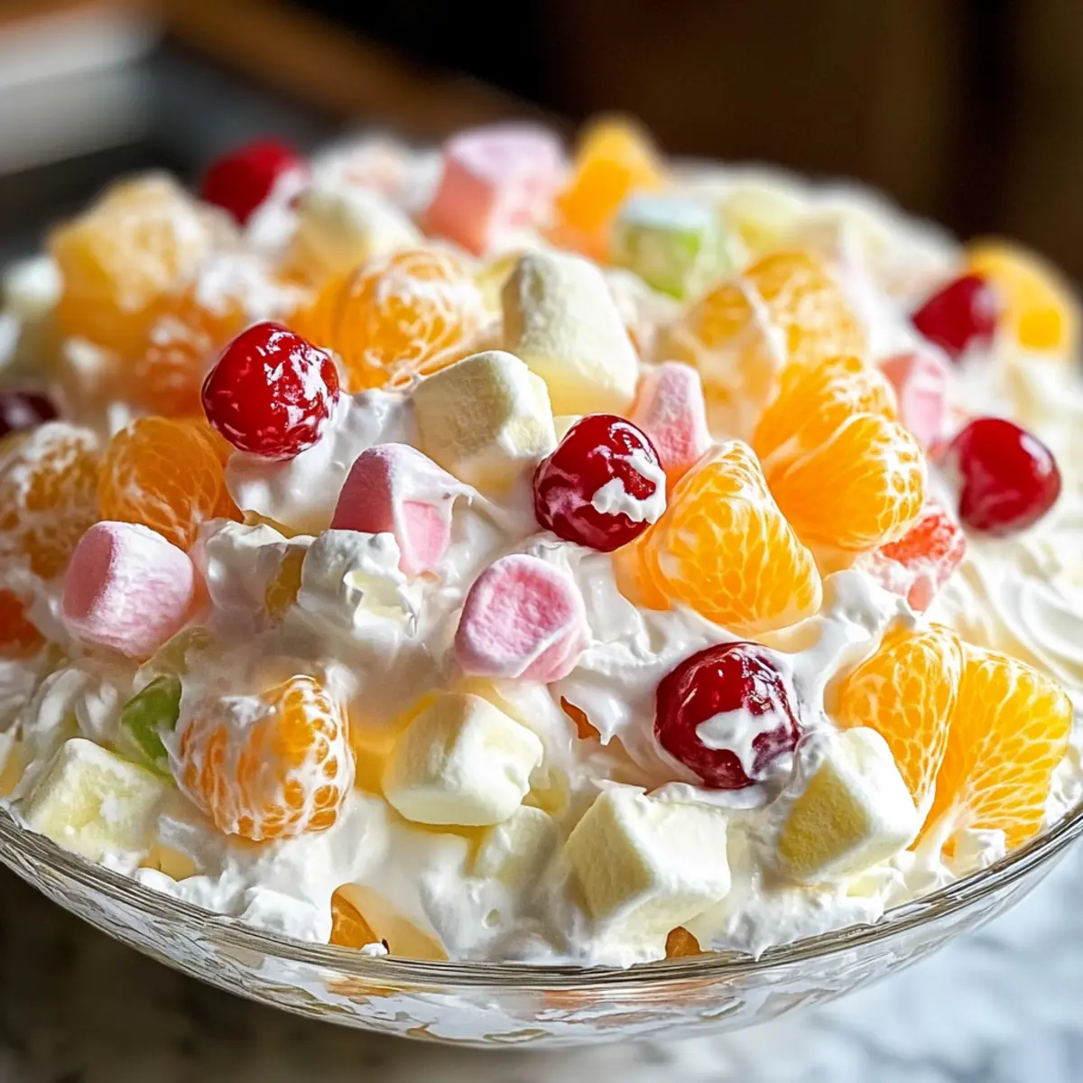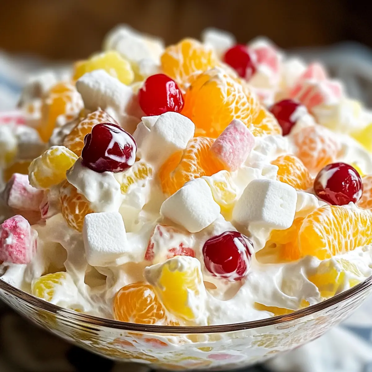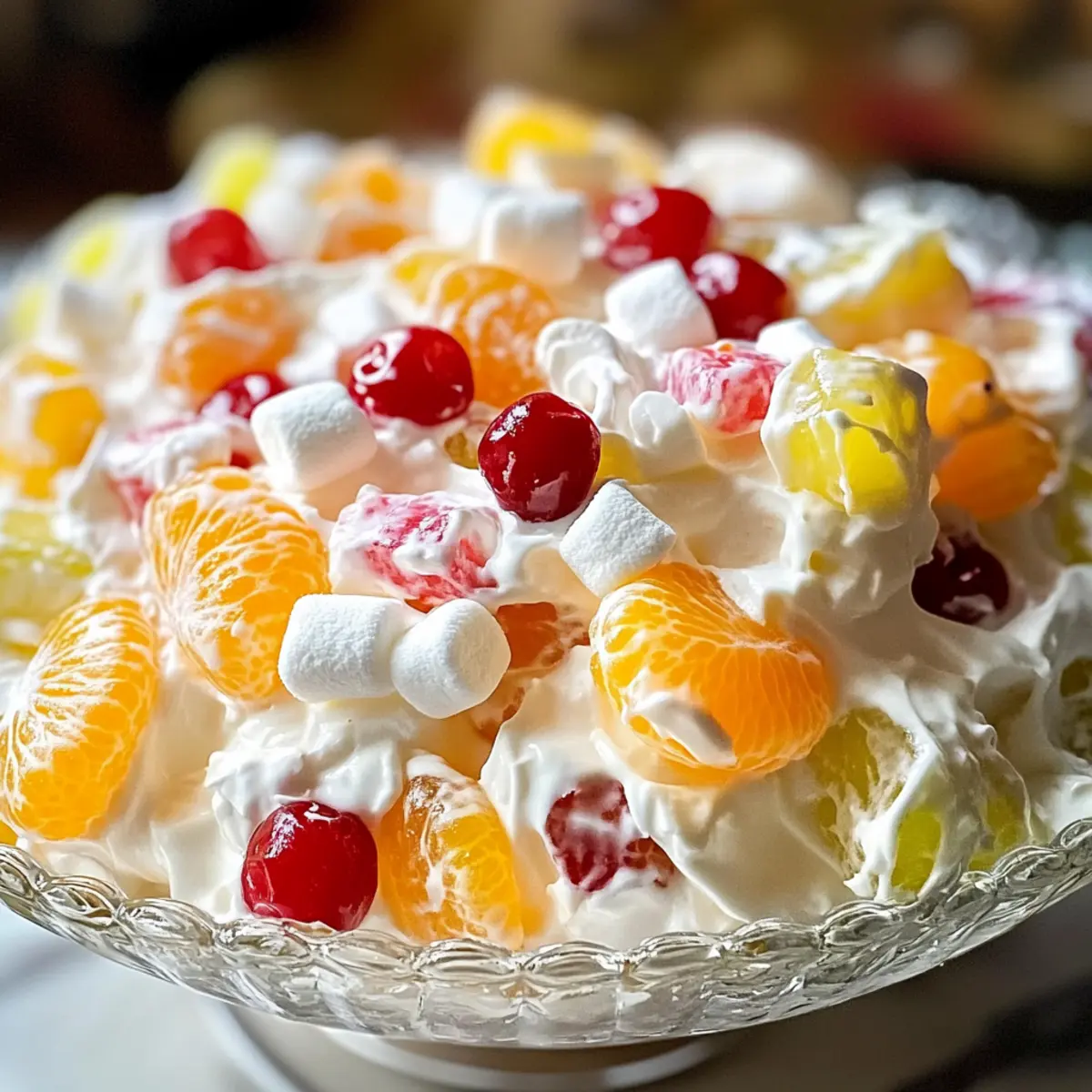Nostalgic Flavors: This creamy fruit salad brings back cherished memories of springtime celebrations with its blend of colorful fruits and fluffy textures.