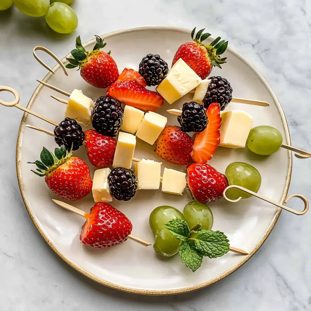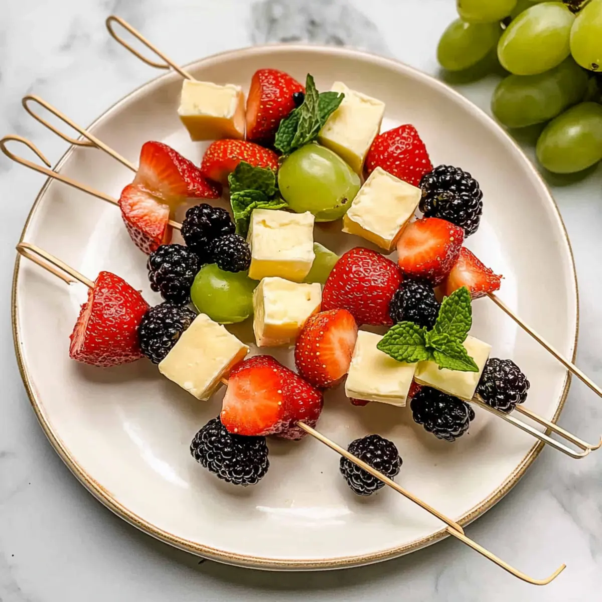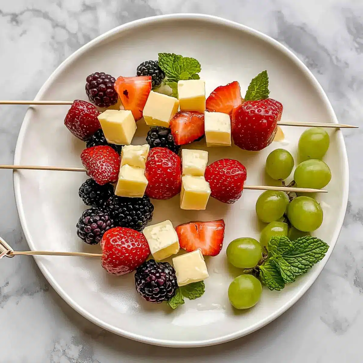 These Easy Fruit and Cheese Kabobs are perfect for busy home cooks looking to save time during the week! You can prepare the fruit and cheese components up to 24 hours in advance. Simply wash and cut the strawberries and blackberries, then store them in an airtight container with a light drizzle of lemon juice to prevent browning. The cheese cubes can also be cut and kept in the fridge to maintain their freshness. When you’re ready to serve, simply thread the prepared ingredients onto skewers, adding mint leaves for flavor and presentation. This way, you can have a delightful, ready-to-serve appetizer without any last-minute stress!