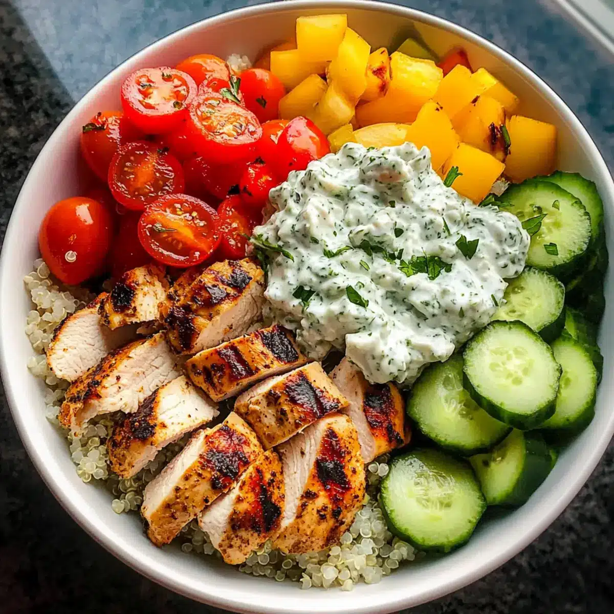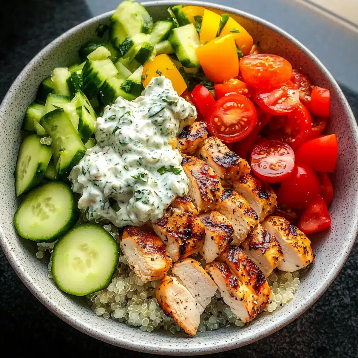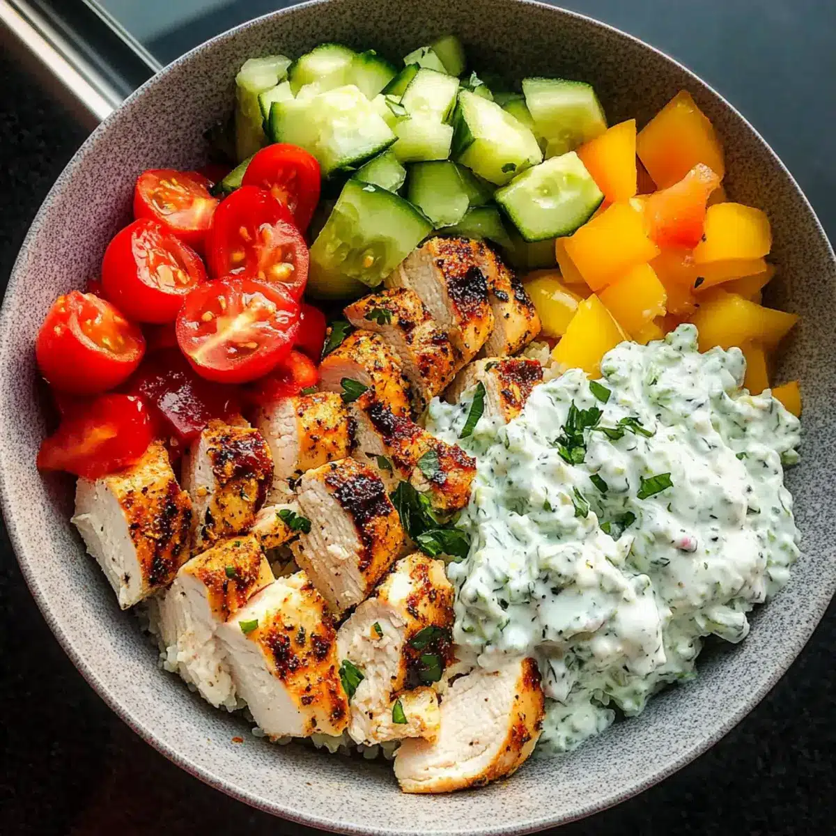 - Assemble Bowls: Start with a scoop of rice or quinoa, layer with fresh diced cucumbers, tomatoes, bell peppers, and sliced rested chicken. Drizzle with tzatziki.