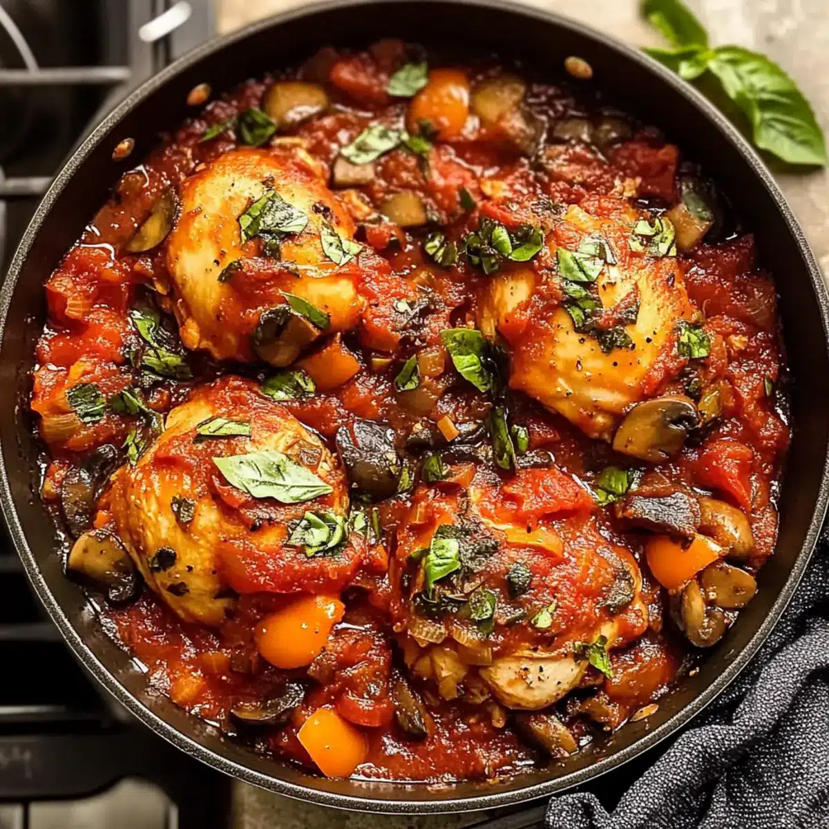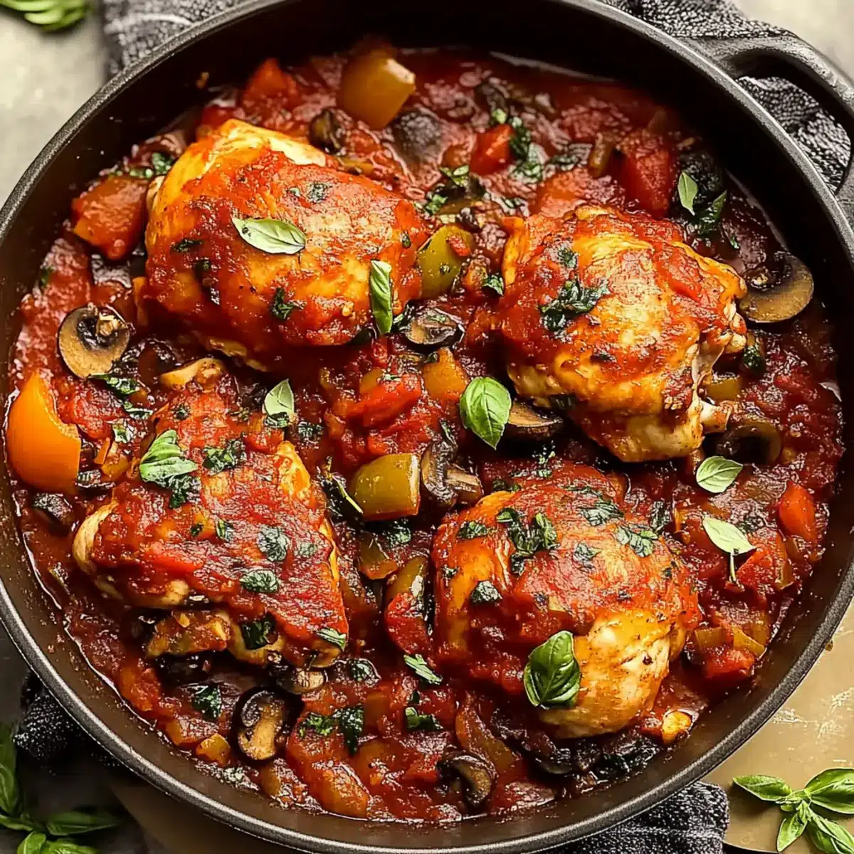 Once baked, remove the pot from the oven and let it rest for a few minutes. Garnish your Hearty Easy Chicken Cacciatore with fresh basil for a burst of color and flavor. Serve it hot alongside some crusty bread or a refreshing salad, inviting your family to enjoy this comforting meal together.