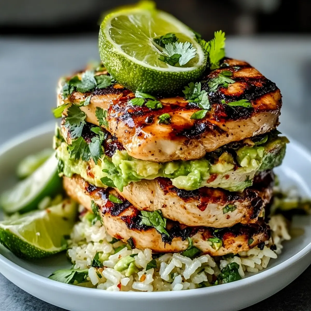 Using a mold or simply stacking on a plate, begin layering by spooning a generous portion of the creamy avocado rice as the base. Slice the grilled chicken breasts and arrange them on top of the avocado rice, creating a delightful Honey Lime Chicken Avocado stack. Garnish with fresh cilantro or parsley, and sprinkle optional chili flakes and toasted sesame seeds for an extra crunch.