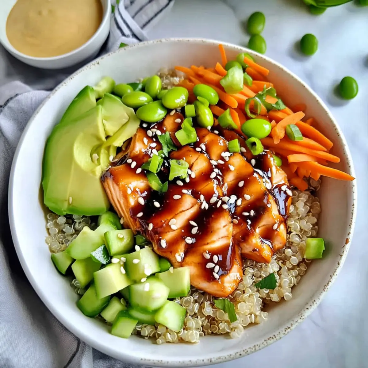 - Assemble Bowl: Start with a base of rice or quinoa, layer veggies, and place salmon on top.