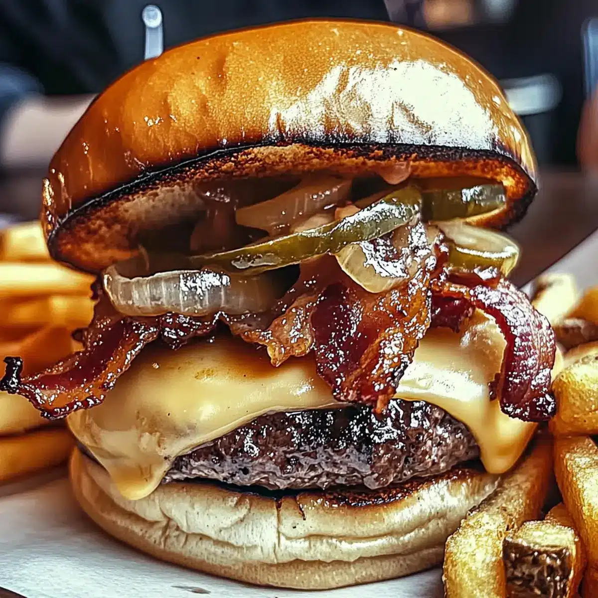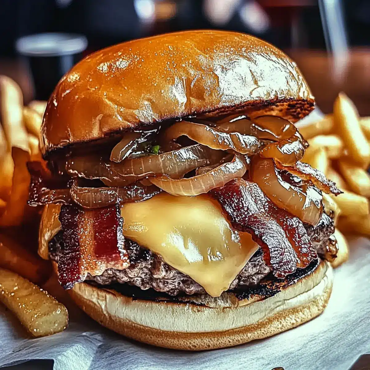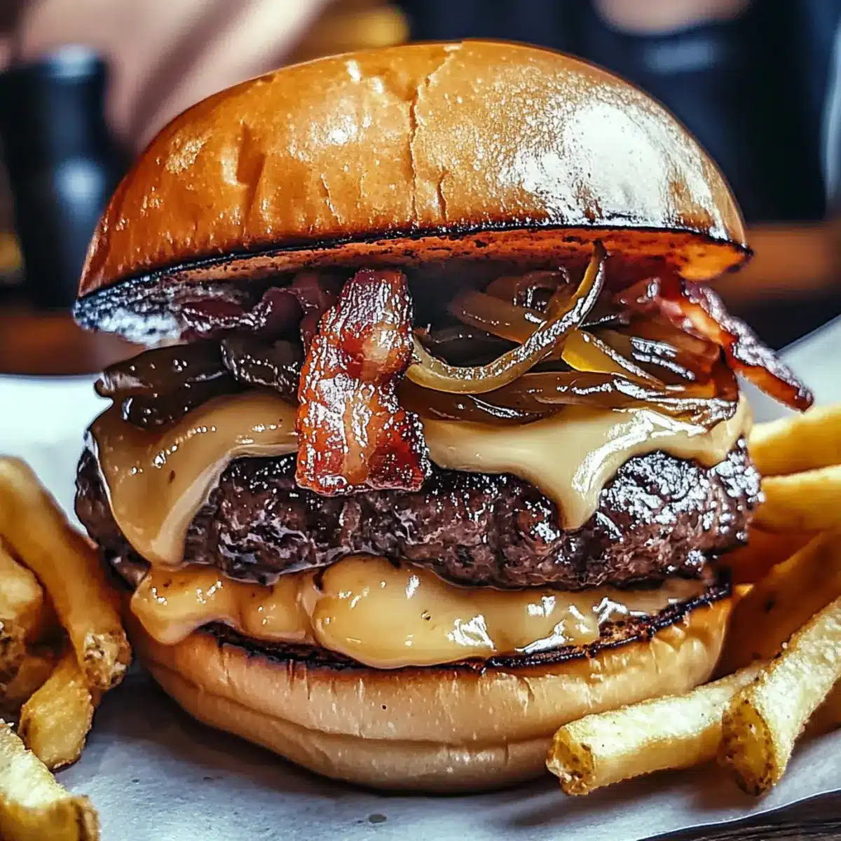 - Assemble burgers with patty, cheese, caramelized onions, bacon, and sauce on toasted buns.