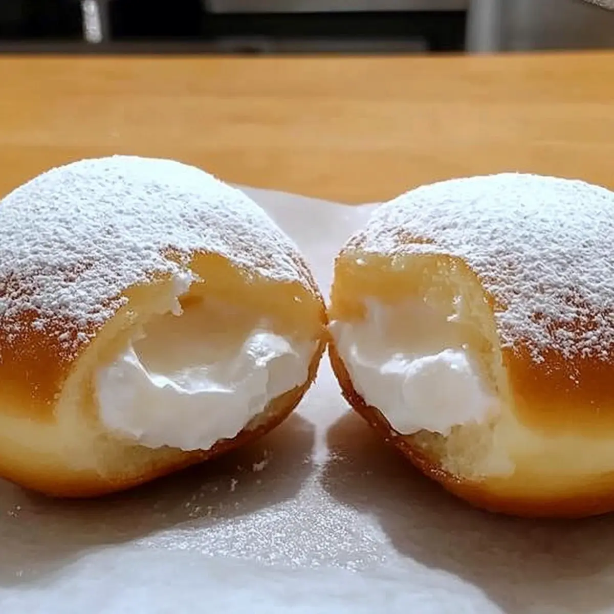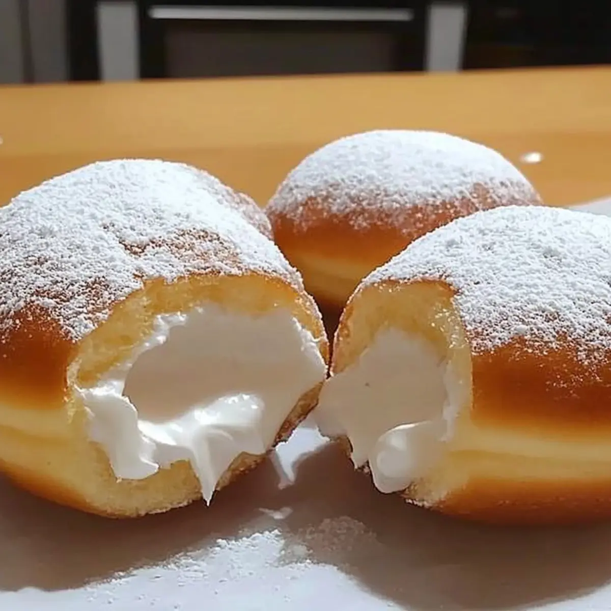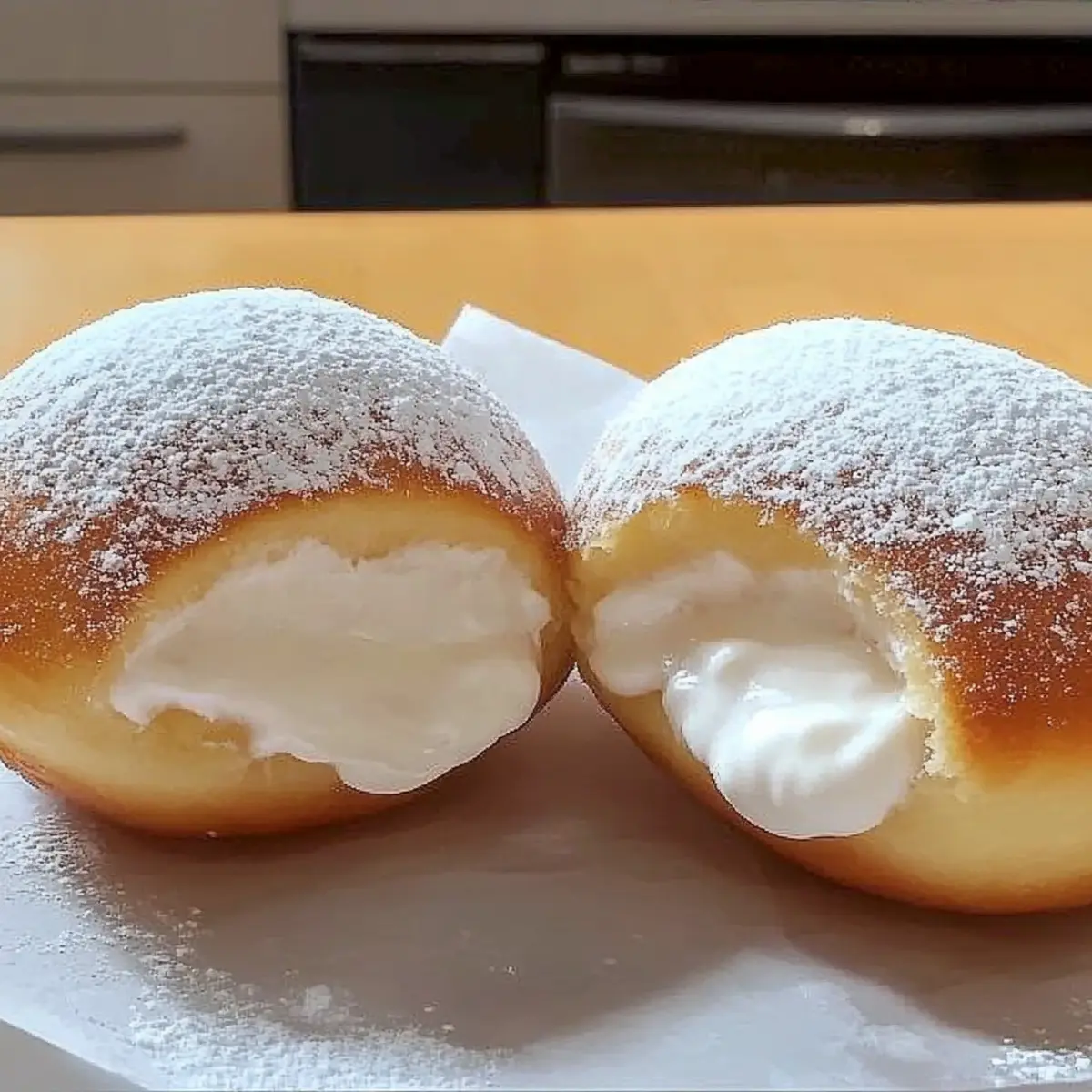 Once the donuts have cooled completely, cut them in half with a sharp knife. Spread a little condensed milk inside if desired, then generously fill each donut with whipped cream, ensuring every bite is a delicious surprise. Finally, dust the donuts with powdered sugar for that classic sweet finish before serving.