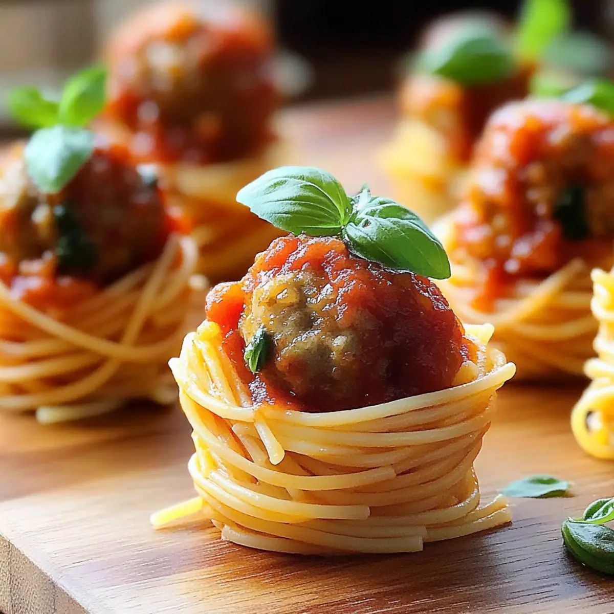 Allow the nests to cool slightly for about 5 minutes before carefully removing them from the pan. Place a warm meatball into each pasta nest, then drizzle generously with your heated sauce. If you’d like, finish off the presentation by garnishing with fresh basil leaves for a pop of color and fresh aroma.