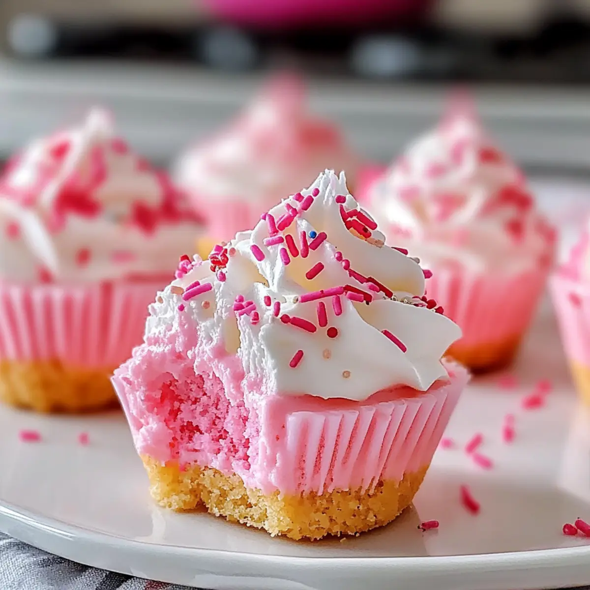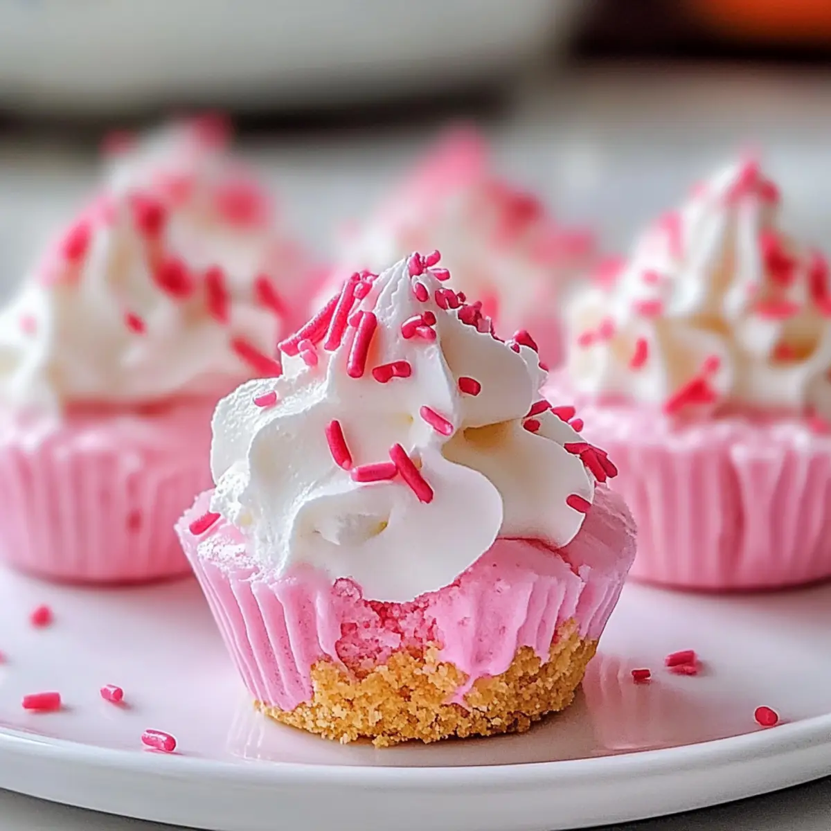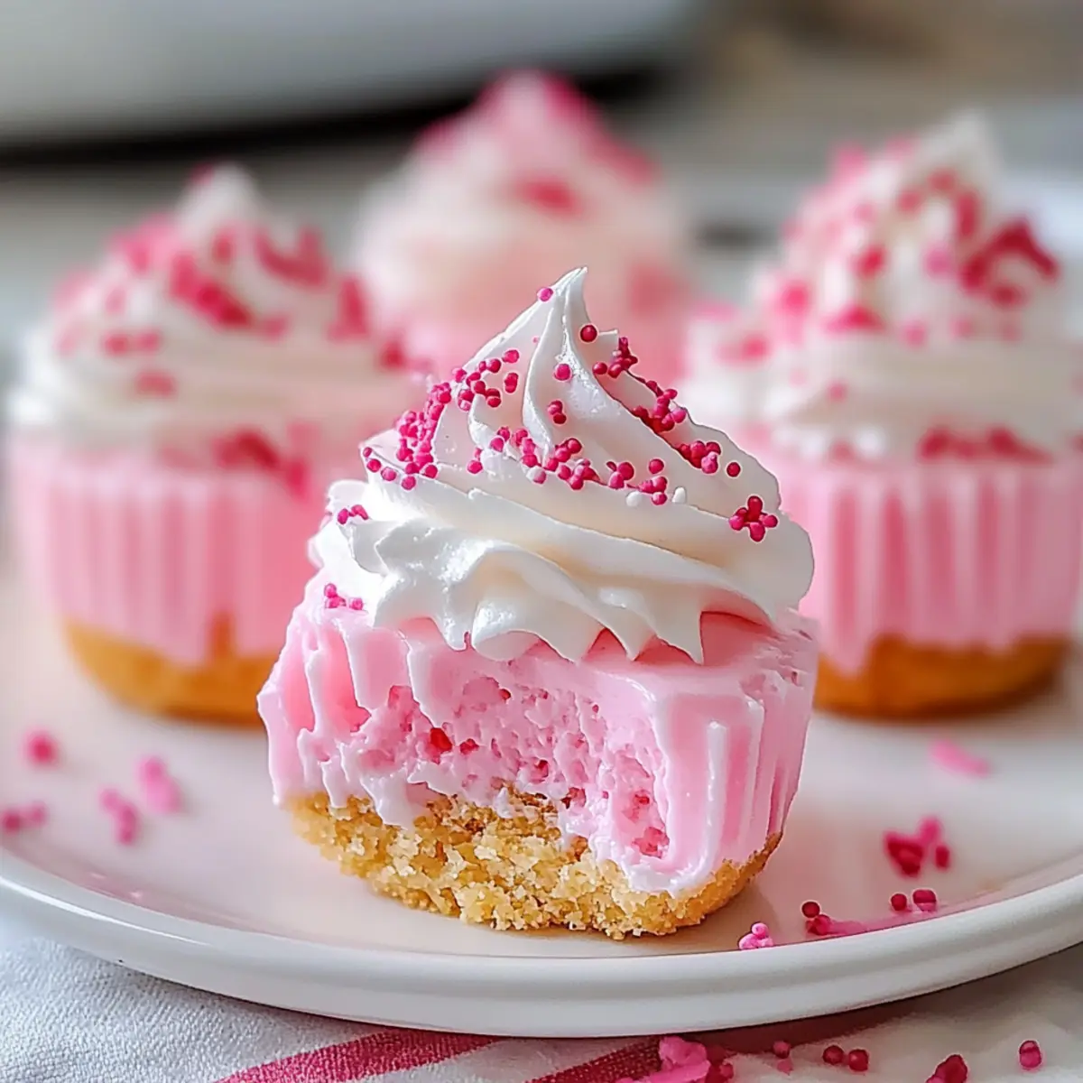 Once set, remove the cheesecake bites from the refrigerator. Top with a generous swirl of whipped cream and sprinkle with optional colorful sprinkles for a festive touch. The contrast of creamy, bright pink cheesecake with the light whipped cream makes for an eye-catching presentation that will surely delight your guests!