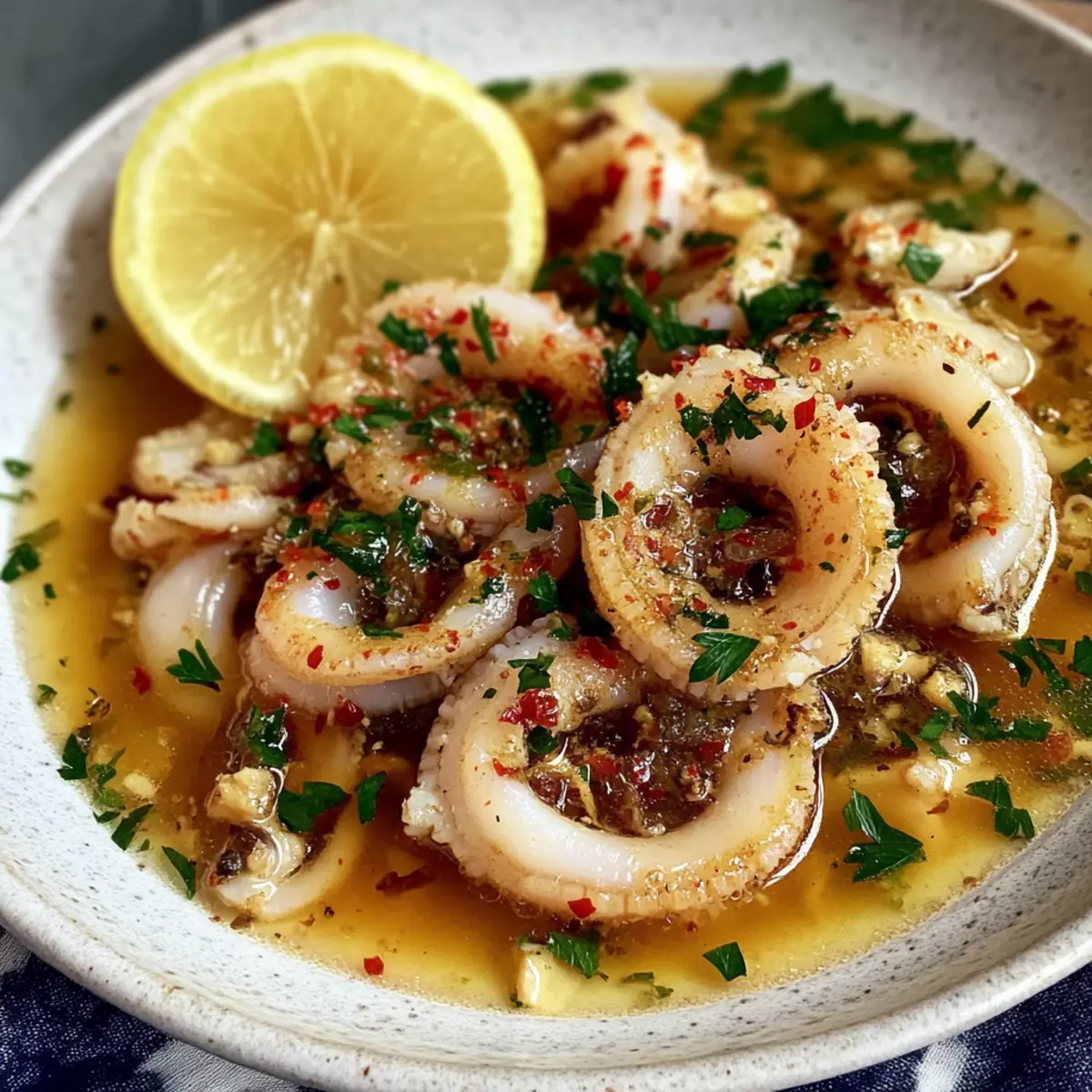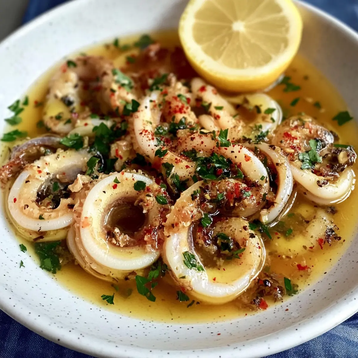 Once the calamari is cooked, remove the skillet from heat. Stir in ¼ cup of chopped fresh parsley and the juice of one lemon. Taste and adjust the seasoning as needed, adding more salt or pepper if desired. This final touch of acidity brightens the dish, enhancing the overall flavor before serving.