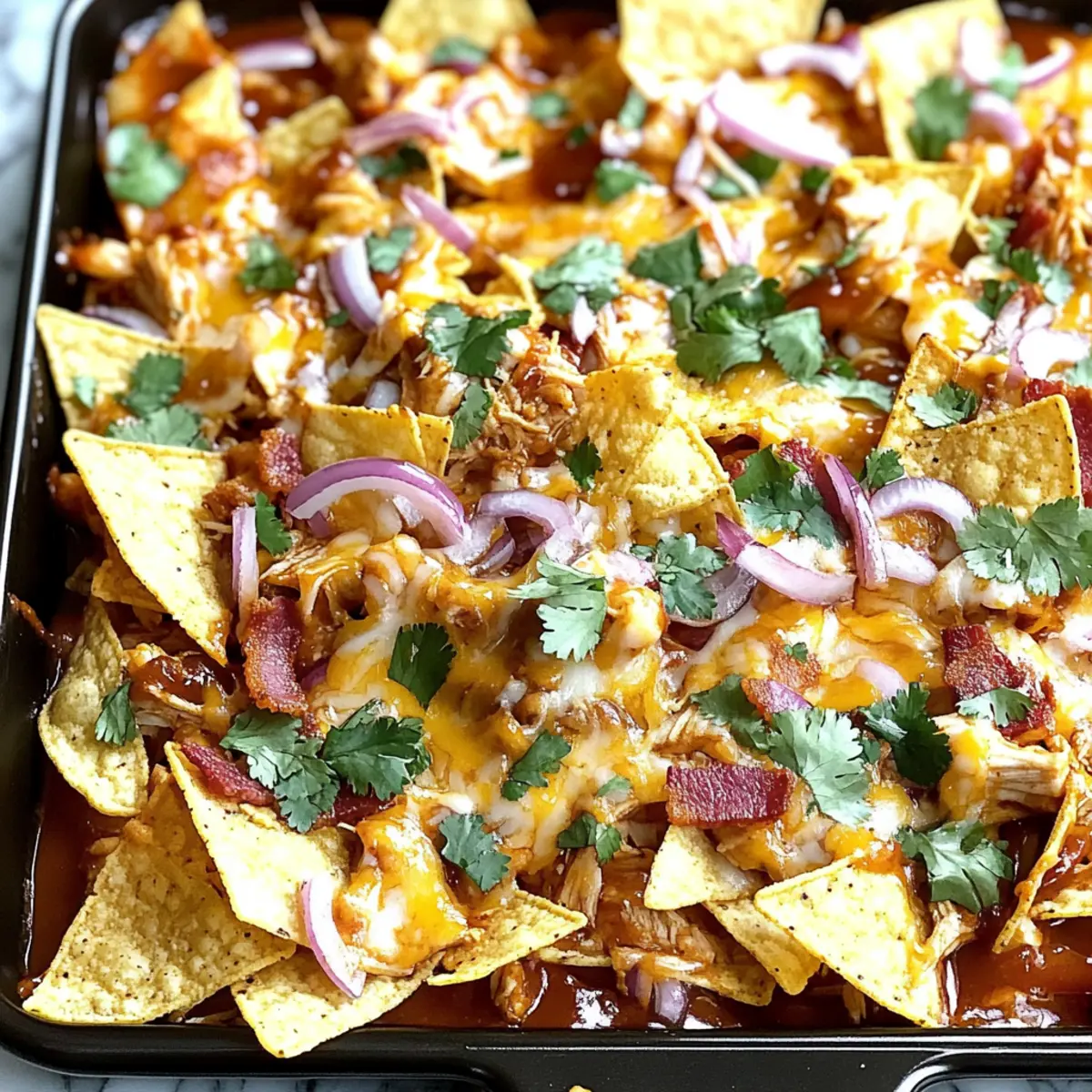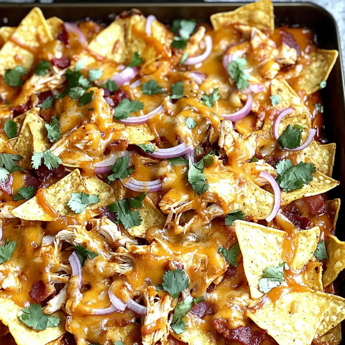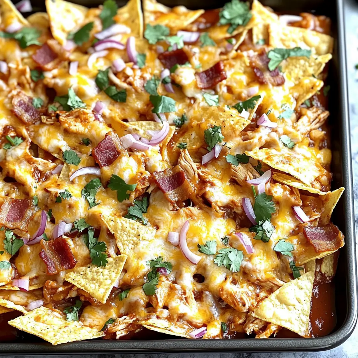 Oh, the soggy chip dilemma is a common concern! To prevent this, I recommend using thick tortilla chips, which hold up better under the toppings. Also, ensure your chicken mixture isn’t oversaturated with BBQ sauce before adding it to the nachos. You can always serve any extra BBQ sauce on the side, so everyone can customize their plate without compromising chip integrity.