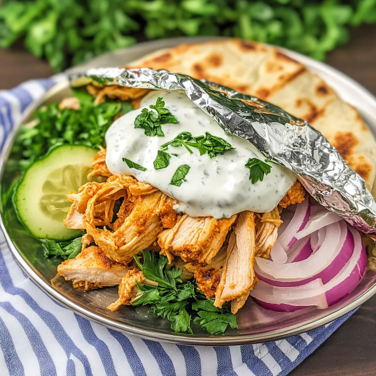 - To serve, warm your pita, layer the shredded chicken, add toppings, and drizzle the yogurt sauce.