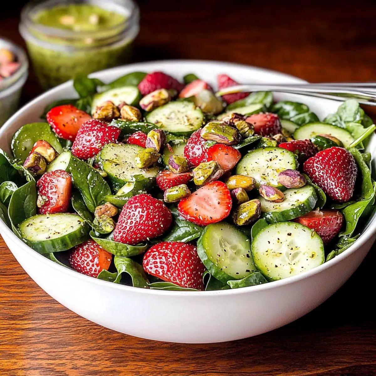 - Top with remaining strawberries, cucumber, and cranberries. Sprinkle with glazed pistachios and drizzle more dressing if needed. Serve immediately.