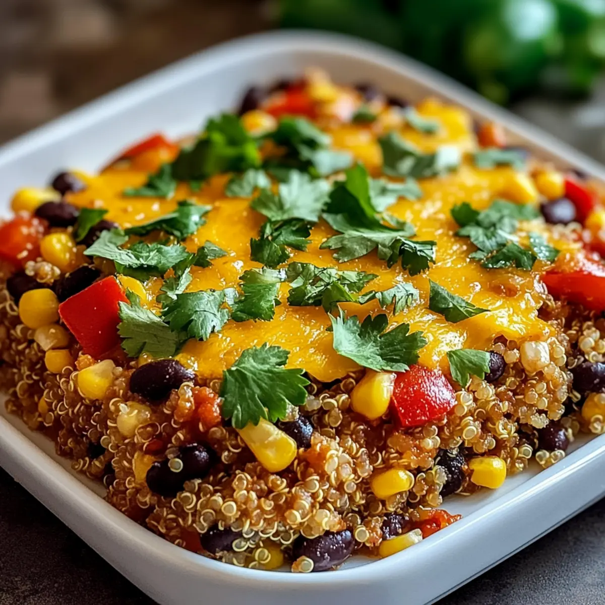 In a large baking dish, combine the rinsed quinoa, 1 can of black beans (drained), 1 cup of corn, 1 can of diced tomatoes (with juices), and 2 cups of vegetable broth. Add one chopped bell pepper and 1 cup of frozen peas to the dish. This vibrant mix sets the foundation for your casserole, so ensure everything is well-distributed.